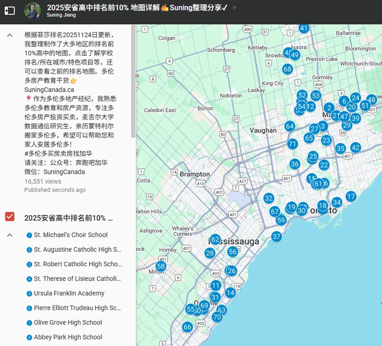 20251124最新版本已更新。根据最新菲莎排名,我整理制作了安省菲莎排名前10%高中的地图,点击了解学校排名/所在城市等,还可以查看之前的排名地图,这里地图中显示的是最新参与排名747所高中的约前10%高中信息。我详细阅读了菲莎排名的官方文件,学校根据其学术表现(以总评分满分10分为衡量标准)按降序排列,总评分越高,学校排名越高。如果学校的总评分相同,则被授予相同的排名。要被纳入排名,学校在2023/2024学年必须至少有10名学生参加9年级EQAO数学测试,并且至少有10名首次符合资格或之前符合资格的学生参加安大略省中学读写能力测试OSSLT。私立学校并不要求进行9年级EQAO测试。只有那些既进行了EQAO测试又允许公布结果的私立学校才能被纳入排名。